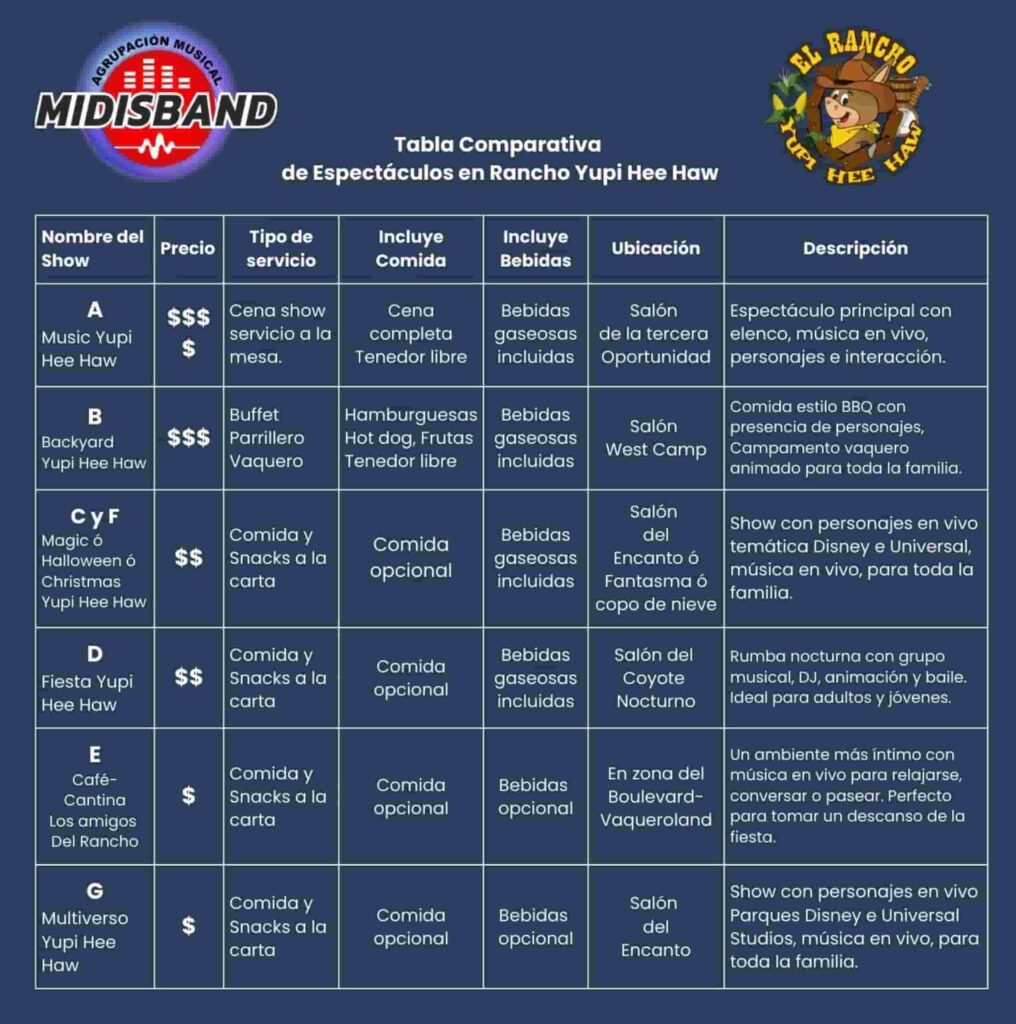 Tabla Comparativa de Espectáculos en Rancho Yupi Hee Haw